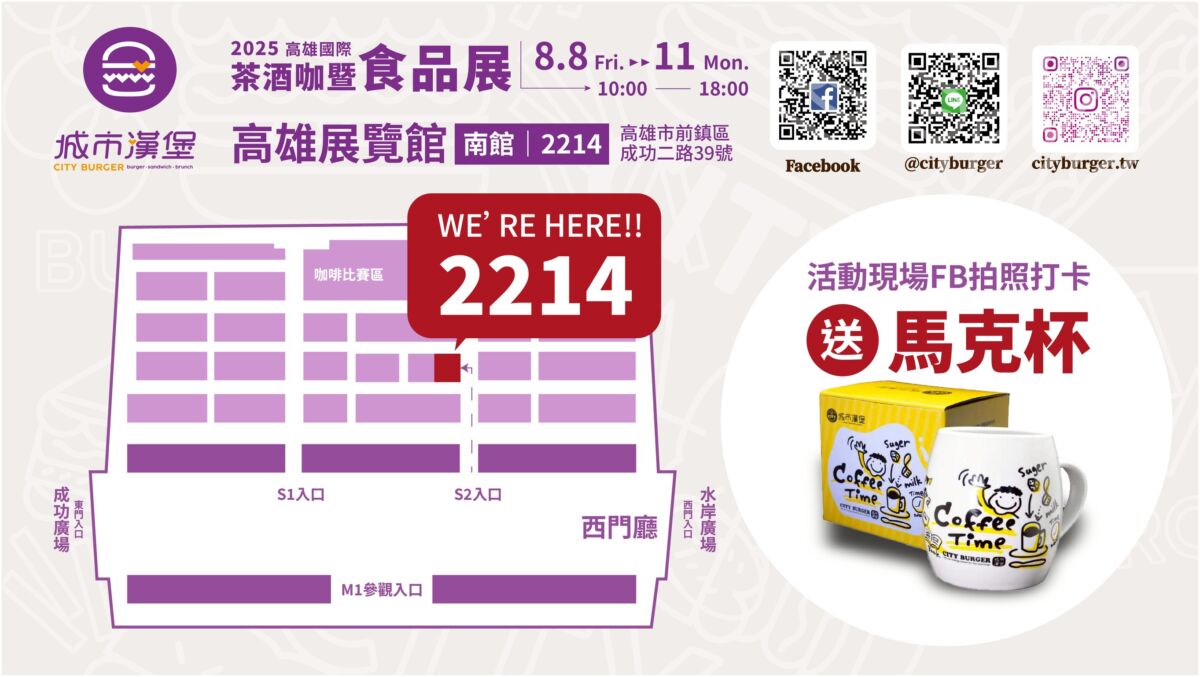 城市漢堡本次展出地點位於「高雄展覽館南館」(編號 2214),每日開放時間為 10:00 至 18:00。除加盟活動與販賣機展示外,現場亦推出「打卡送好禮」活動,凡到場拍照打卡並上傳社群平台,即可兌換限量「城市漢堡紀念馬克杯」一只,數量有限,送完為止。