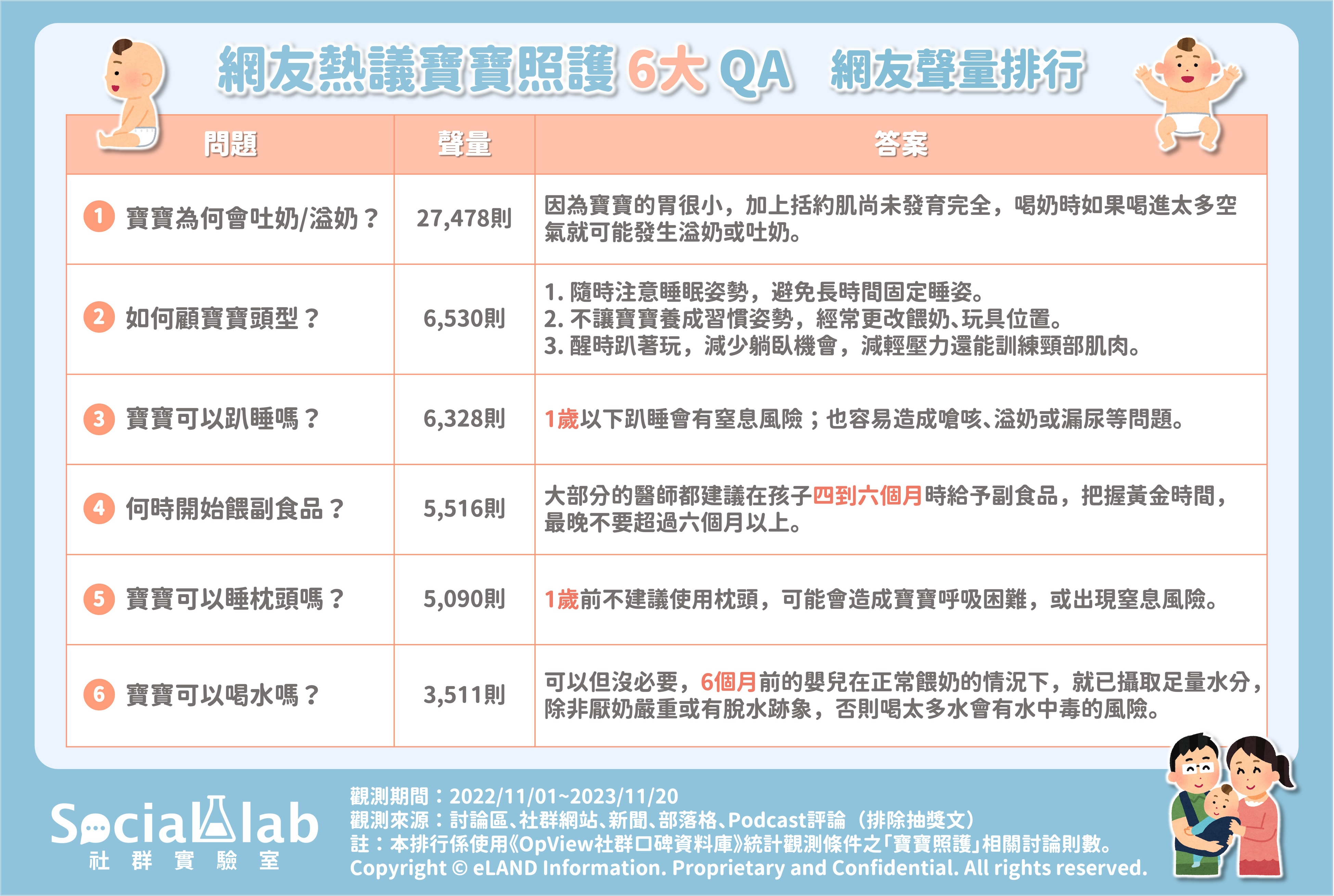 《Social Lab社群實驗室》本次透過《OpView社群口碑資料庫》追蹤近一年「寶寶照護」相關話題的網路聲量,帶您了解網友熱議的6大寶寶照護QA。