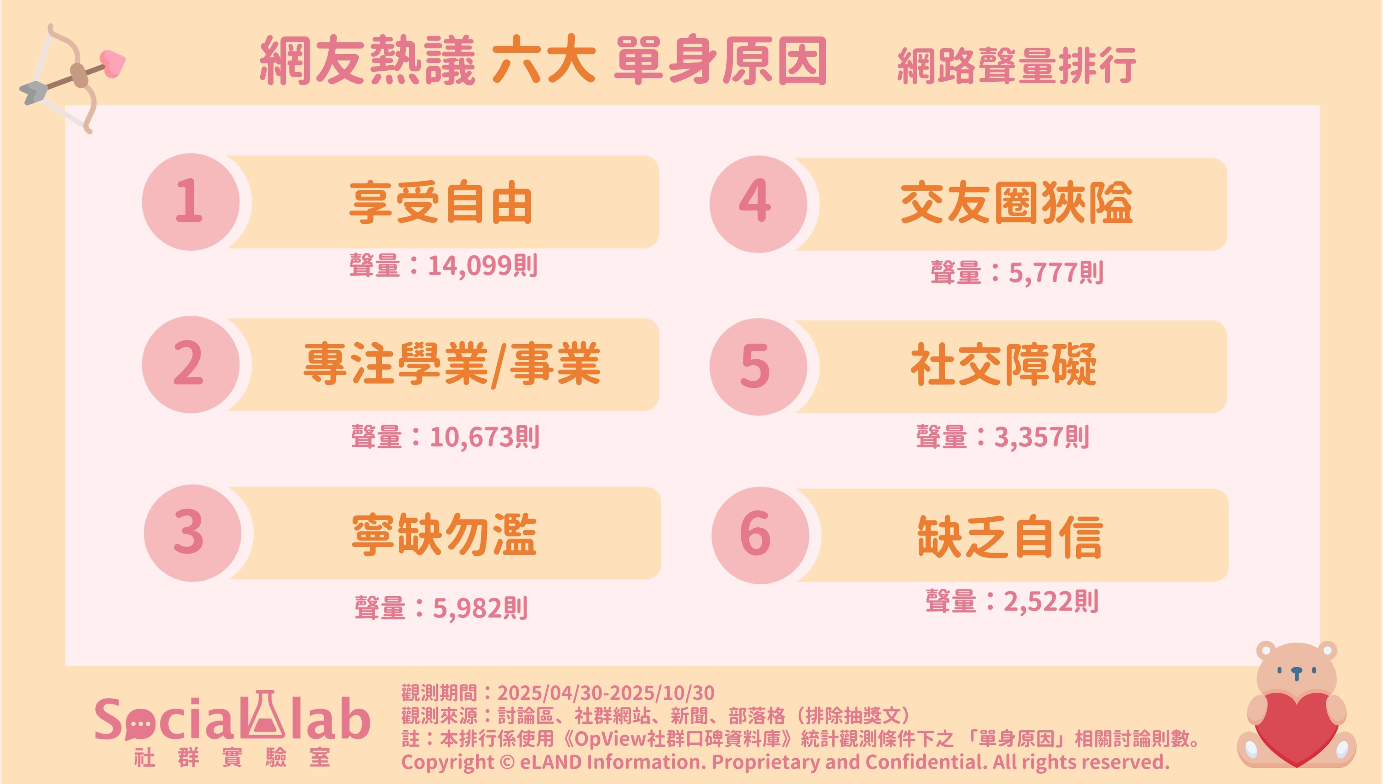 ▲ 網友熱議TOP6單身原因 網路聲量排行